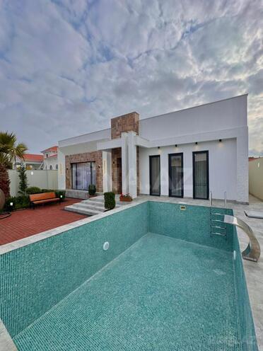 sizə ekoloji təmiz Mərdəkan qəsəbəsində 4.2 Sotda 1 mərtəbə 180 kv.m 4 otaqlı super bağ evini təklif edir. Bağ evi zal, mətbəx, 3 yataq otağı, holl və 2 sanuzeldən ibarətdir. Otaqlarda asılmış pərdə və lyüsturları, divar rəsmləri, hündür tavanları, duş kabinalı sanuzeli, mebelli mətbəxi, quraşdırılmış işıqlandırma sistemi var. Ev yüksək zövq və keyfiyyətlə təmir olunub. Su, qaz, işıq daimidir. İstilik sistemi kombidir, isti döşəməsi var. Həyətində geniş filterli hovuzu, şəlaləsi, cambalkon besedka (mebellər ilə), stol-stul, manqalxana, yelləncək, yay-qış mətbəxi, maşın saxlamaq üçün yer, pultla idarə olunan darvaza, dekorativ ağacları və gülləri, su anbarı, sensorlu gecə işıqları var. 4 mövsüm yaşamaq üçün əlverişlidir. Yolu qapıya kimi asfaltdır. Kupçası (Çıxarışı) var. Start qiyməti 375 000 AZN.